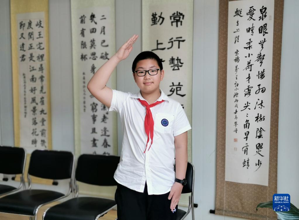 大陳島老墾荒隊員后代、浙江省臺州市椒江區(qū)實驗二小學(xué)生李杭駿行隊禮(2019年5月27日攝)。新華社發(fā)(王衛(wèi)君 攝)
