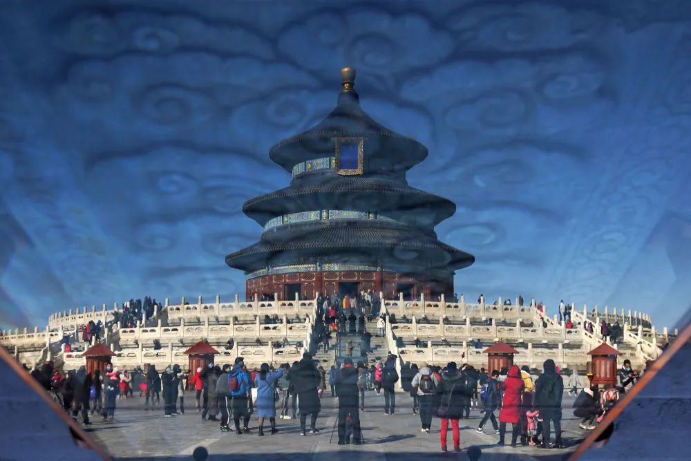 這是2021年2月17日通過玻璃反光拍攝的游客在天壇公園參觀游覽(照片旋轉180度)。新華社記者 鞠煥宗 攝