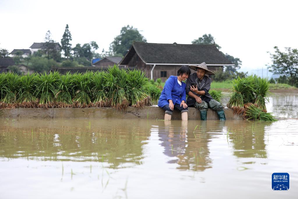 6月10日,在貴州省黔東南苗族侗族自治州丹寨縣興仁鎮(zhèn)燒茶村,村民整理秧苗間歇,坐在水田旁觀看手機視頻。