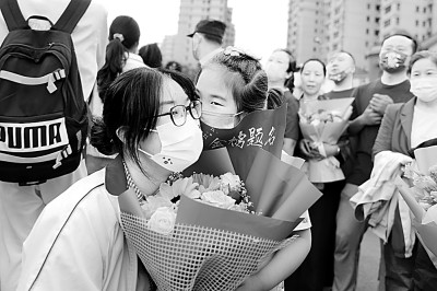 山東青島考場外的溫馨一幕。張鷹攝/光明圖片