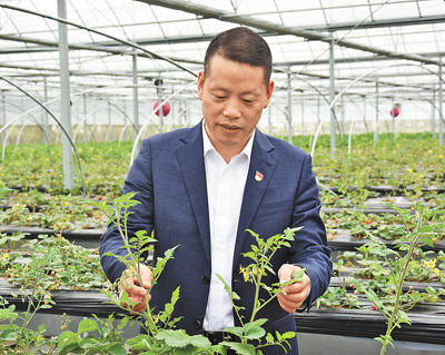 傅平均在滕頭村的立體草莓大棚察看草莓生長情況。