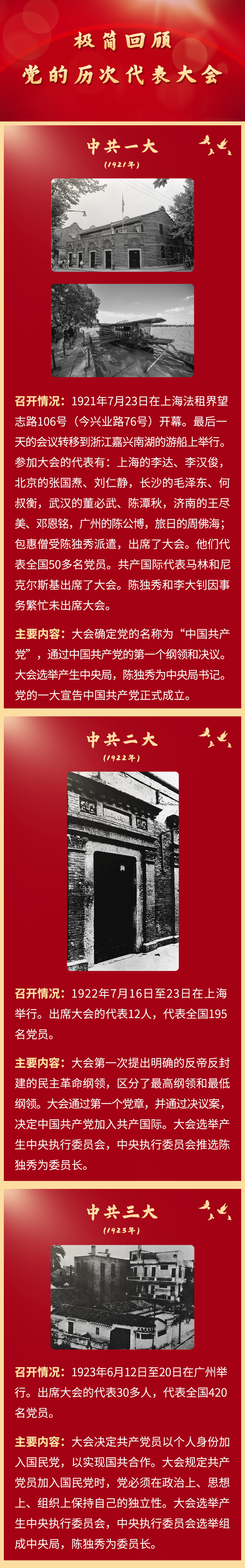 黨的二十大即將隆重開幕。此次會議是在全黨全國各族人民邁上全面建設社會主義現代化國家新征程、向第二個百年奮斗目標進軍的關鍵時刻召開的一次十分重要的大會。黨建網微平臺依據《中國共產黨一百年大事記》整理了黨的一大至十九大“極簡史”,邀您一起學習了解中國共產黨歷次全國代表大會概況。