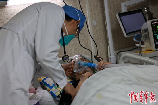 12月27日,北京朝陽醫(yī)院發(fā)熱門診留觀病房,呼吸與危重癥醫(yī)學科主任醫(yī)師賀航詠在與重癥患者溝通。