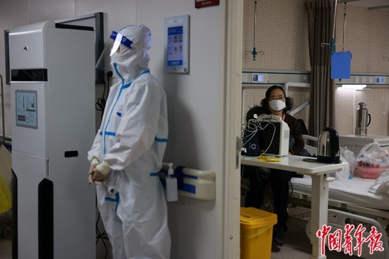 12月27日,北京朝陽醫(yī)院發(fā)熱門診留觀病房,一名病情趨于平穩(wěn)的新冠重癥患者準備轉移到其他病房,一名醫(yī)護人員在門外待命。