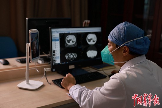 12月27日,北京朝陽醫(yī)院,腫瘤科副主任醫(yī)師關印在互聯(lián)網(wǎng)診室內為患者遠程看病。患者下載“朝陽健康云”APP,即可預約在線問診。