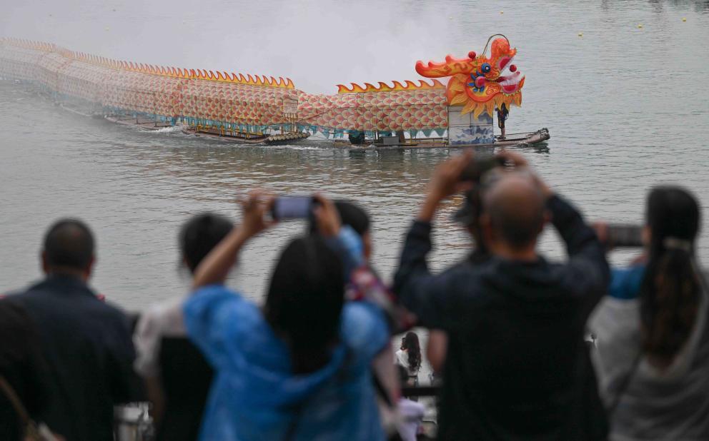 5月31日,在重慶市銅梁區(qū)安居古城,觀眾觀看“神龍攬勝”游江表演。