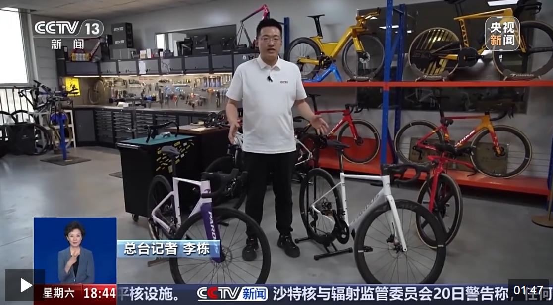總臺記者 李棟:這兩款自行車,造型基本相同,但因為材質(zhì)差異,重量大不一樣。這一款國產(chǎn)碳纖維自行車,它的車架部分重量僅僅不到700克,非常輕盈。而另一款自行車,它的車架是由鋁合金材質(zhì)構(gòu)成,相對于700克而言,它的重量重了接近3倍。更加輕盈的碳纖維自行車也帶來了更好的騎行運動體驗。