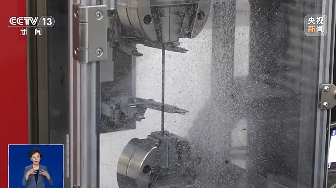 中國石化上海石化質(zhì)量管理中心分析五車間副主任 林婷:剛剛我們做的是測試碳纖維強度性能的一個試驗,目前我們碳纖維強度能達到40S的標準,就相當于這一根的樣條,它的強度的值相當于我們家用2臺汽車的牽引力總和。
