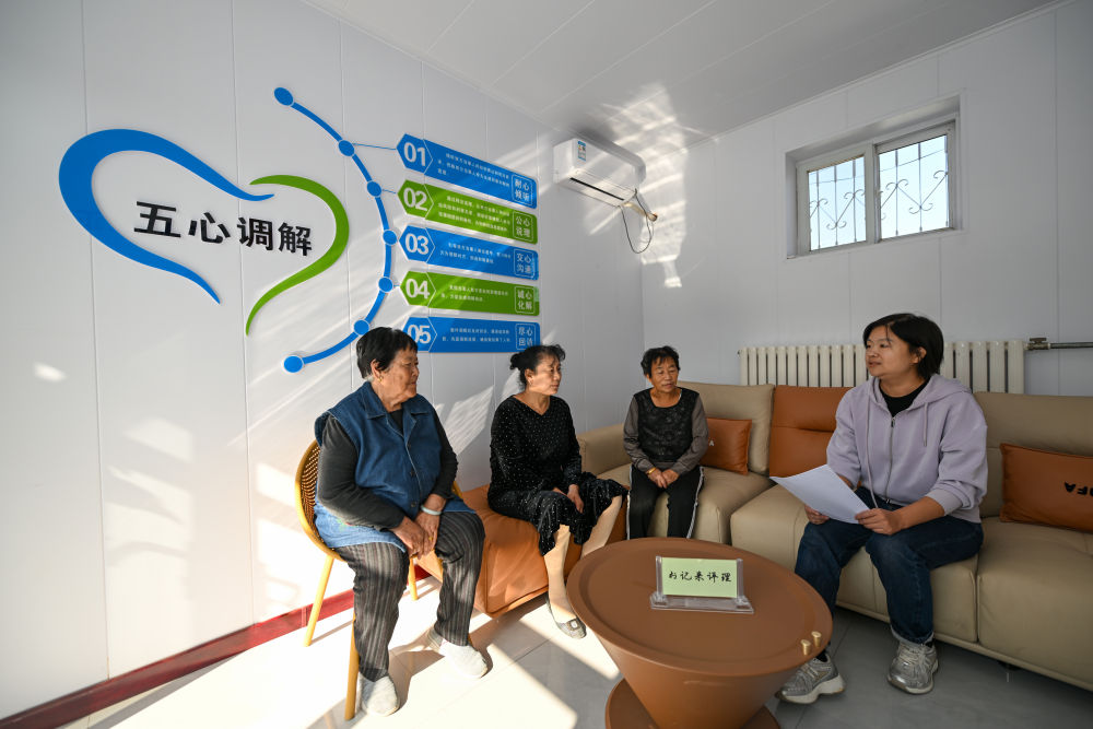 在天津市寧河區(qū)蘆臺街道金華路社區(qū),社區(qū)黨總支副書記吳蕊(右一)就社區(qū)監(jiān)控設備安裝問題為社區(qū)居民進行解答(2024年10月11日攝)。金華路社區(qū)積極踐行新時代“楓橋經驗”,將原社區(qū)居委會閑置用地提升改造成為聯(lián)絡群眾的基層綜合治理陣地——“解鈴小院”。新華社記者 孫凡越 攝