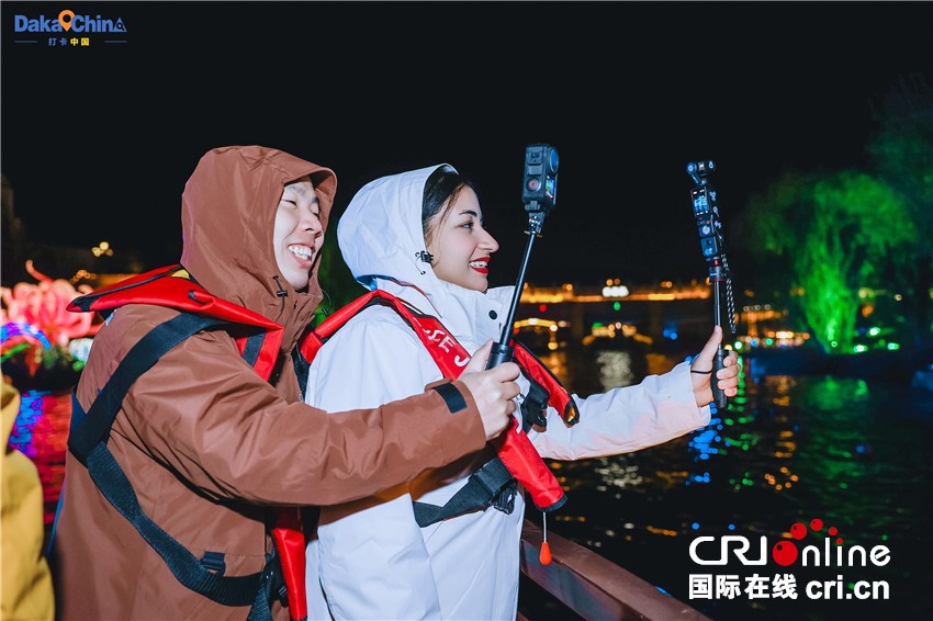 晚上的汴河兩岸,光影交織,槳聲四起。采風團乘船游覽,看古城夜景與國潮演繹完美融合,不禁連連稱奇。