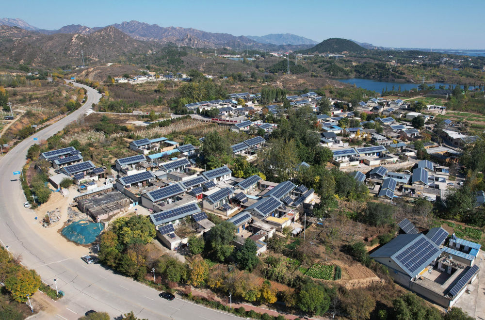 11月2日拍攝的河北省平山縣西柏坡鎮北莊村兆瓦級“光儲”智能微電網示范工程項目中的屋頂光伏發電板(無人機照片)。新華社記者 楊世堯 攝