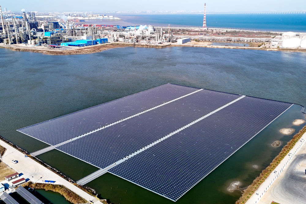11月18日拍攝的中國石化青島煉化公司漂浮式光伏項目。新華社發(張進剛攝)