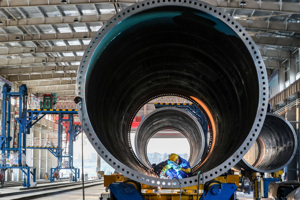 11月20日,在甘肅省酒泉經濟技術開發區的中國水電四局(酒泉)新能源裝備有限公司塔筒制造車間,工作人員進行風機塔筒焊接作業。新華社記者 郎兵兵 攝