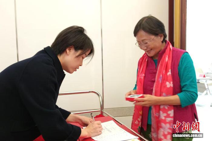 11月20日,金馬臺澎兩岸交流協會一行向中國閩臺緣博物館捐贈家書家藏。圖為臺胞林初美(右)捐贈玉鐲。任雨祥 攝