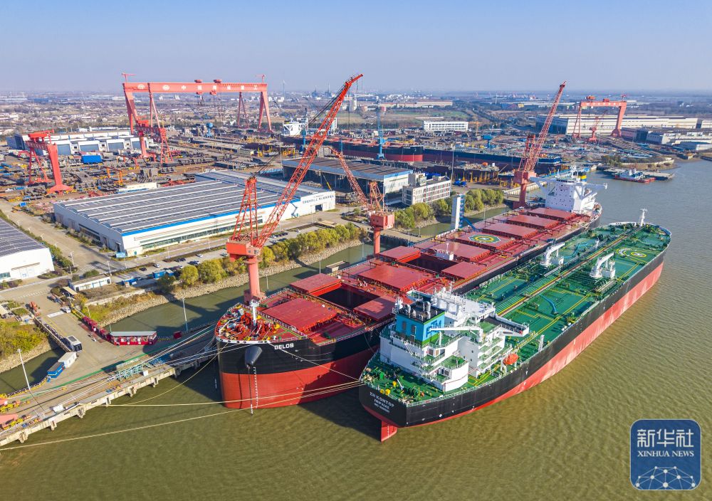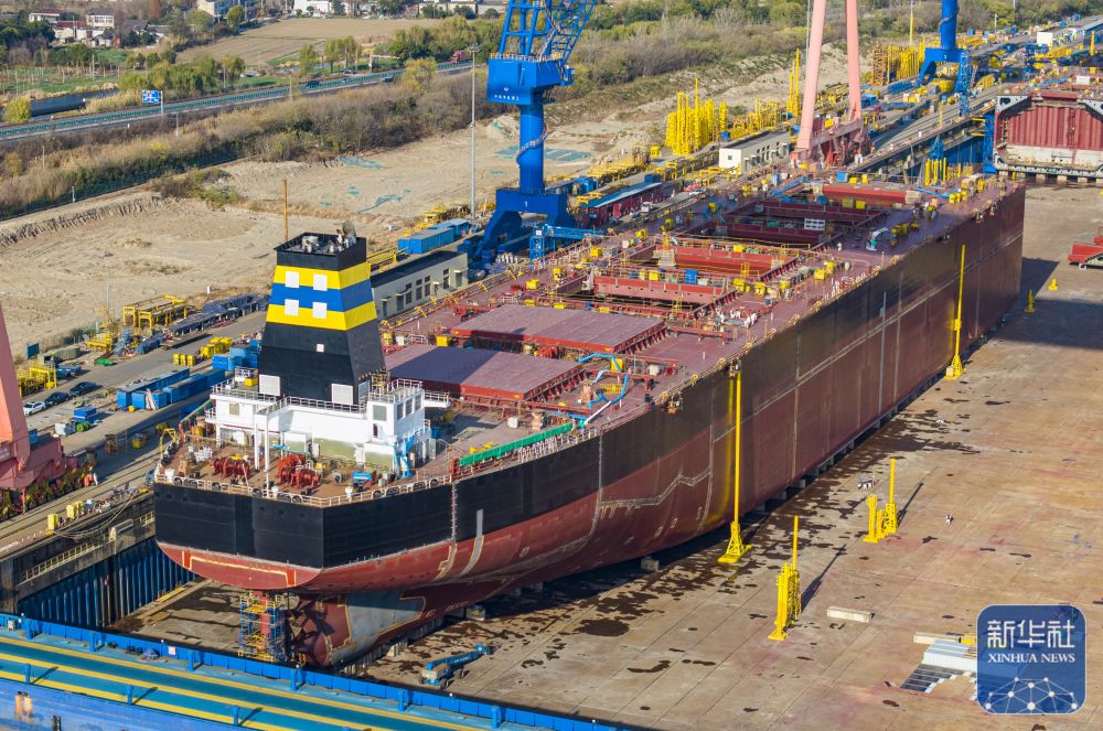 ↑ 12月15日,在江蘇南京招商工業南京金陵船廠生產廠區,大型船舶在建造中(無人機照片)。新華社發(辛一攝)
