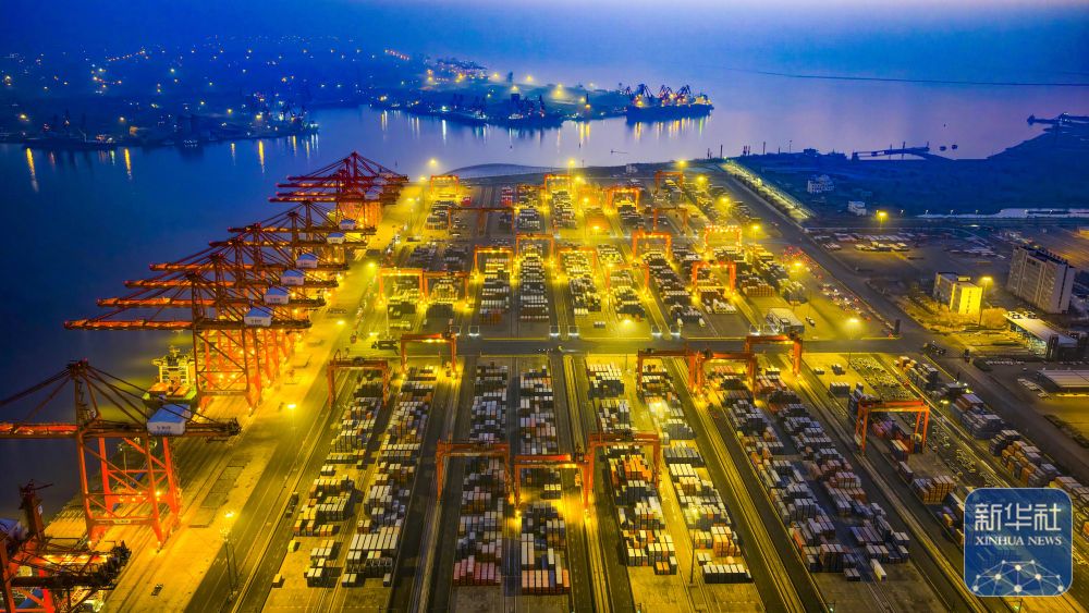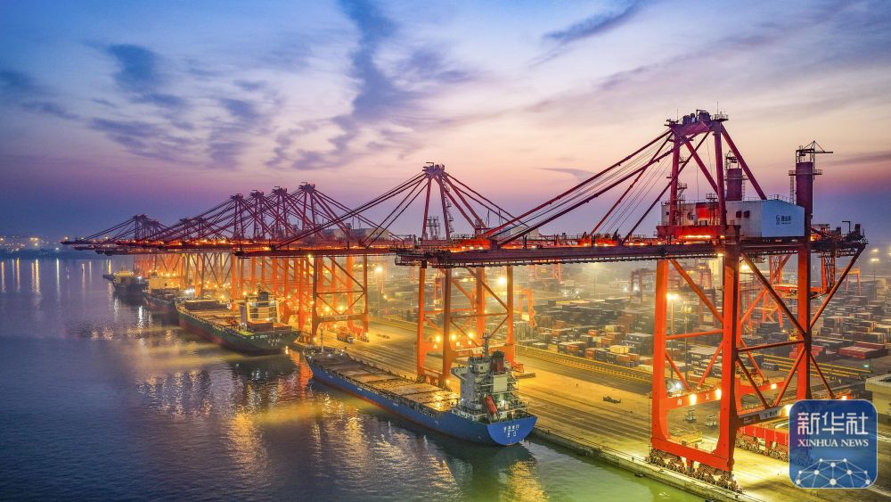 ↑ 12月15日,在山東港口青島港,貨輪在裝卸外貿集裝箱(無人機照片)。新華社發(俞方平攝)
