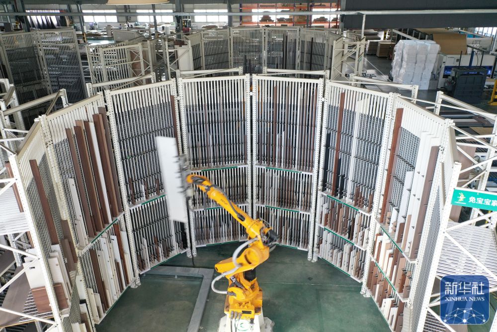↑ 12月15日,在位于浙江省湖州市德清縣乾元鎮的德華兔寶寶裝飾新材股份有限公司家居產業園,智能分揀機械臂在分揀家具板材(無人機照片)。新華社發(倪立芳攝)