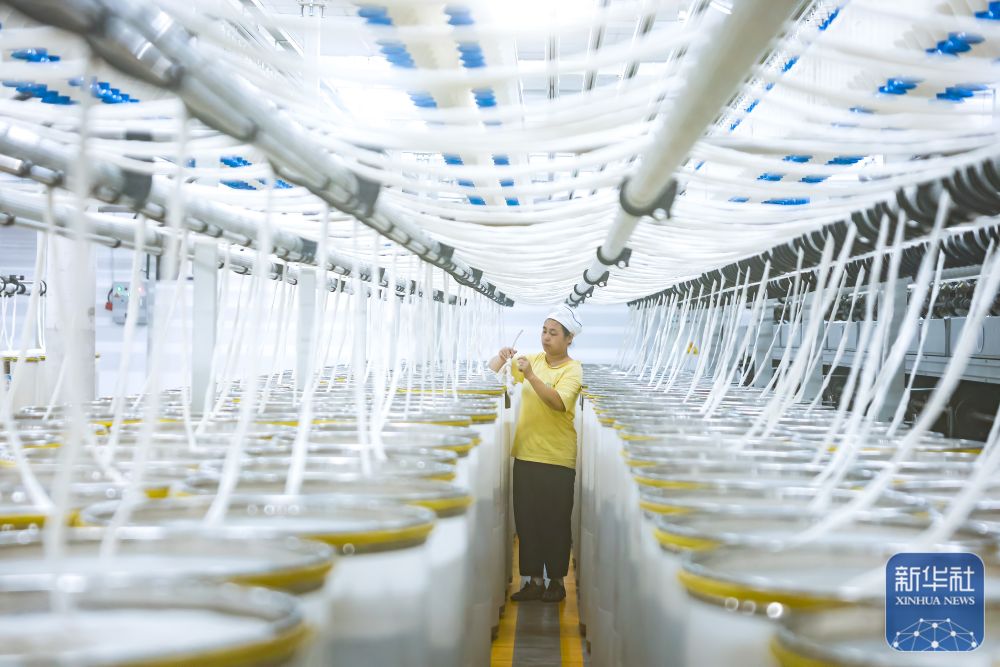 ↑ 12月15日,工人在江蘇省泰州市姜堰區三水街道江蘇泰達紡織科技有限公司智慧紡紗車間忙碌作業。新華社發(顧繼紅攝)