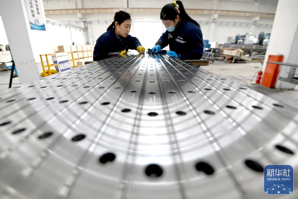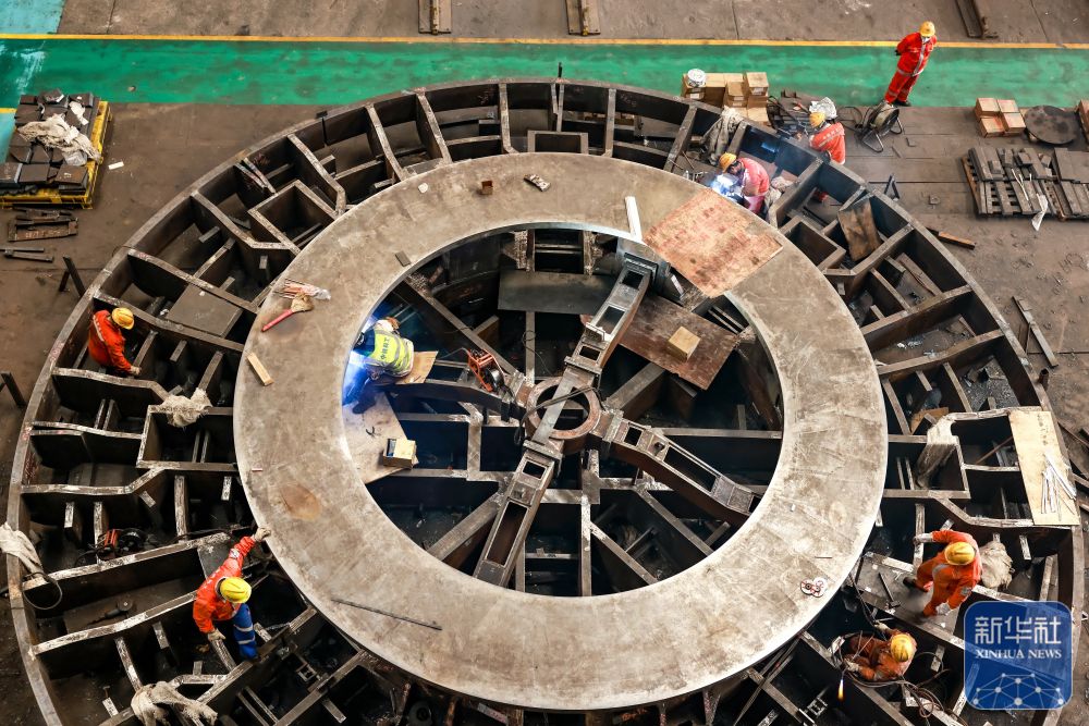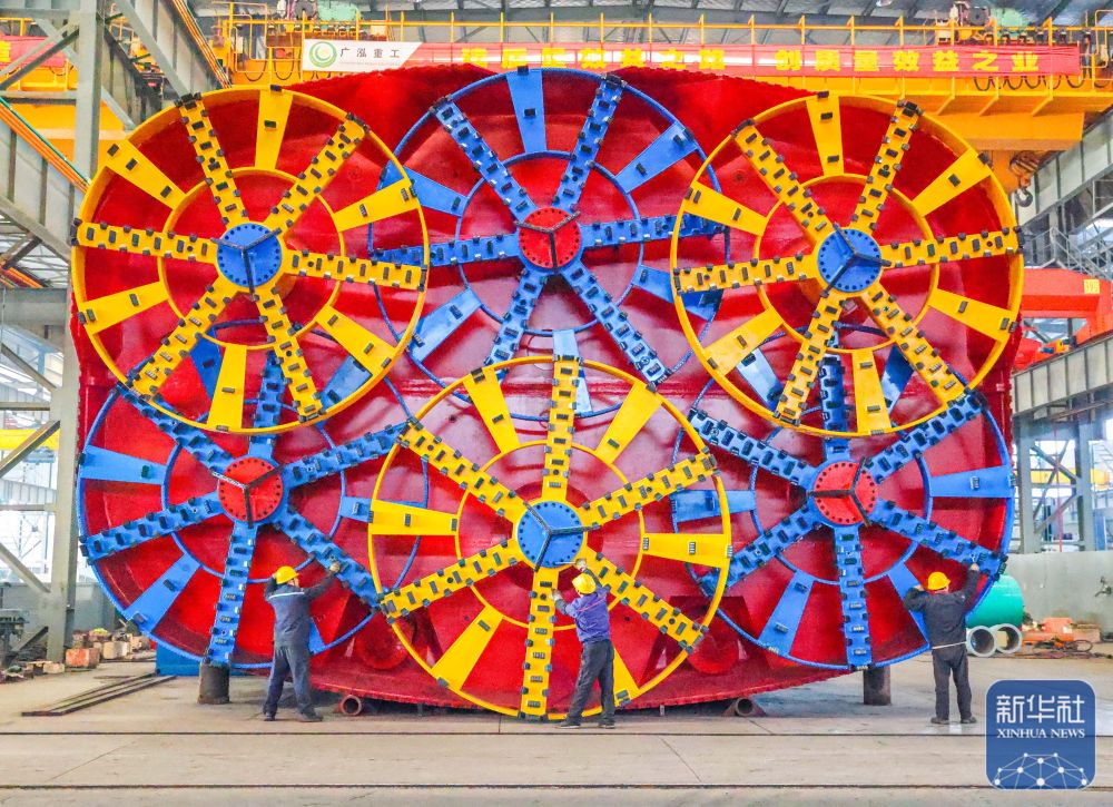 ↑ 12月15日,中鐵科工集團武漢江夏制造基地技術工人對盾構機配件進行裝配作業。新華社發(趙軍攝)