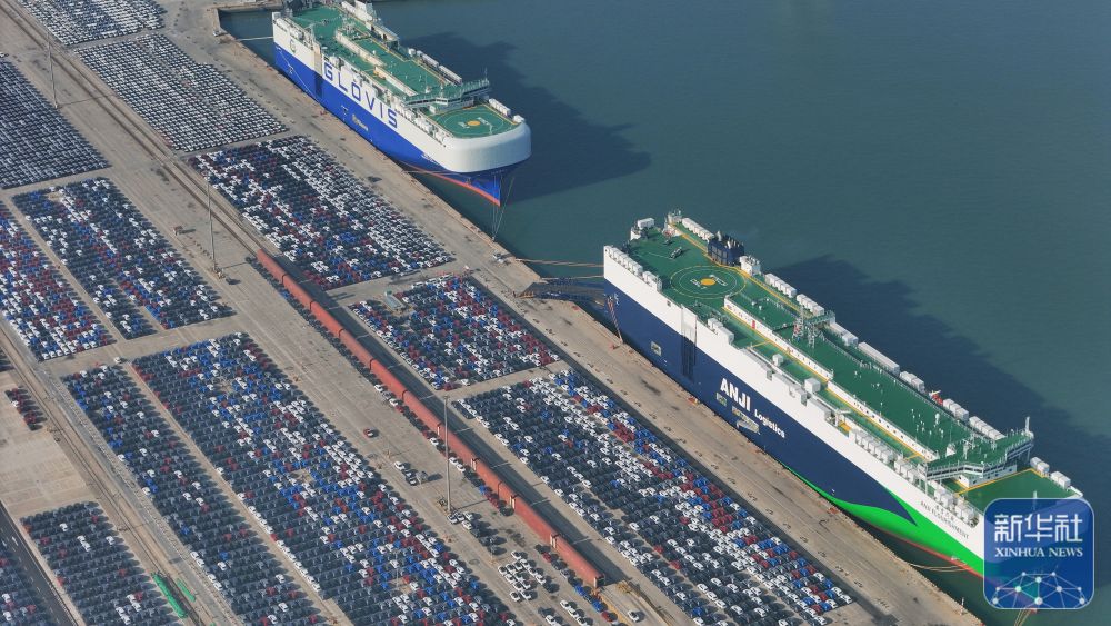 ↑ 12月15日,國產汽車在山東港口煙臺港集結等待裝船出口(無人機照片)。新華社發(唐克攝)