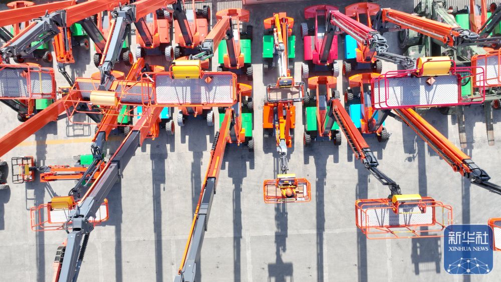 ↑ 12月15日,在位于浙江省湖州市德清縣雷甸鎮的浙江鼎力機械股份有限公司,工人對準備出口的新臂式智能高空作業平臺設備進行檢測(無人機照片)。新華社發(謝尚國攝)