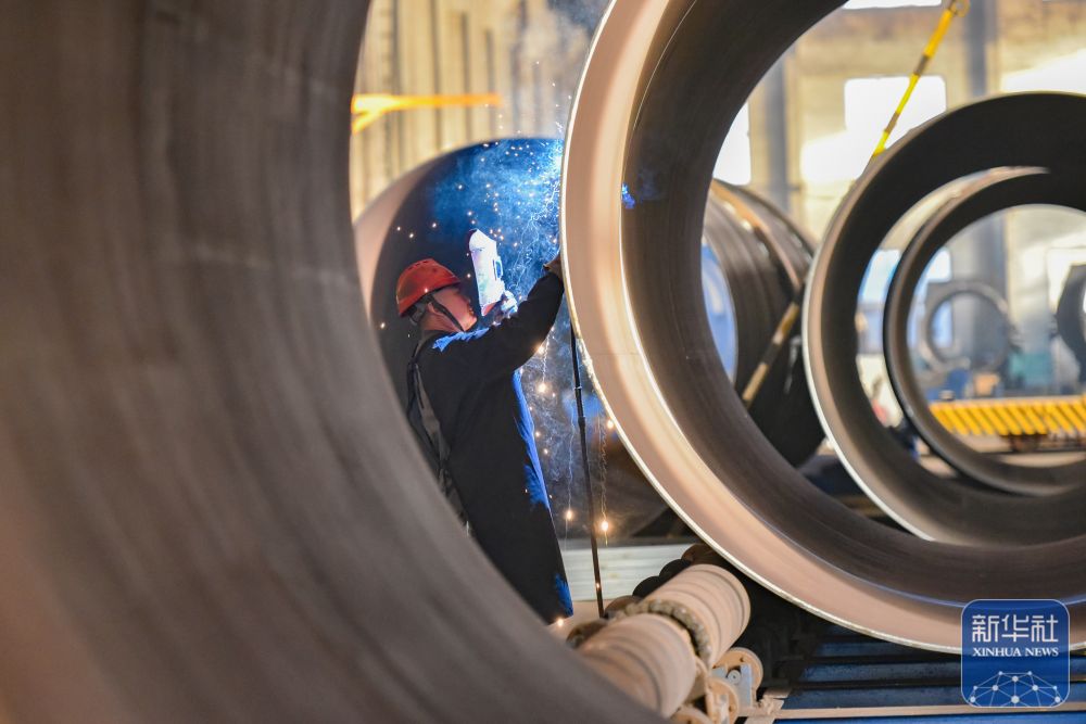 ↑ 12月15日,在山東省青州市益都街道一家大型風電設備制造企業,工人在車間內進行焊接作業。新華社發(王繼林攝)