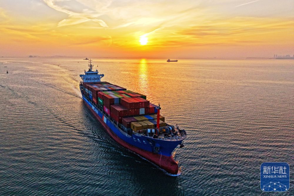 ↑ 12月15日,一艘集裝箱貨輪駛入山東港口煙臺港(無人機照片)。新華社發(孫文潭攝)