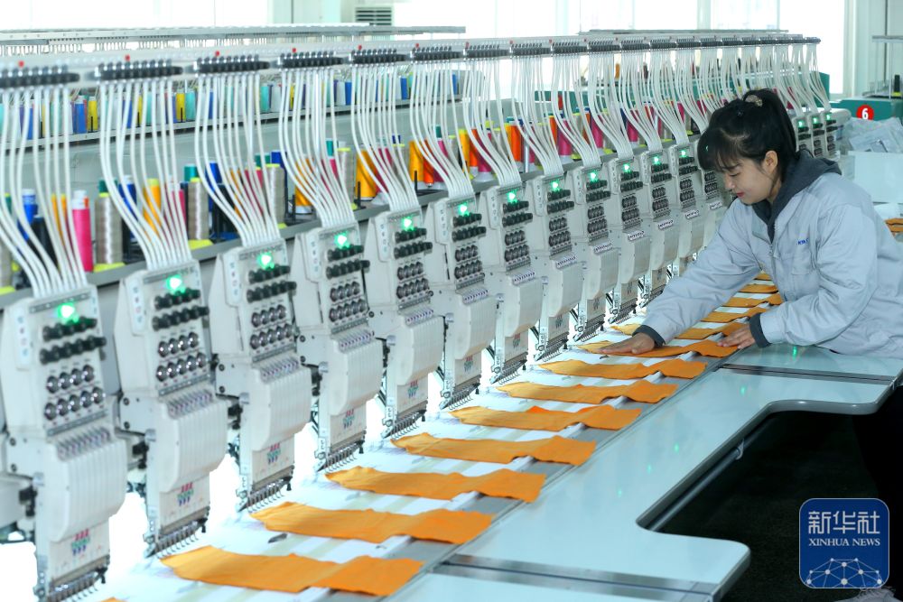 ↑ 12月15日,山東省青島市即墨區即發集團員工在生產服裝繡花產品。新華社發(梁孝鵬攝)