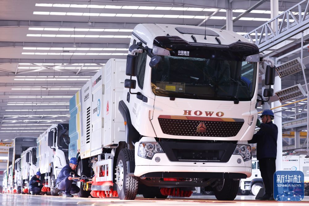 ↑ 12月15日,在河北省石家莊市的冀中裝備石煤機公司,工人在組裝新能源環衛車。新華社發(梁子棟攝)
