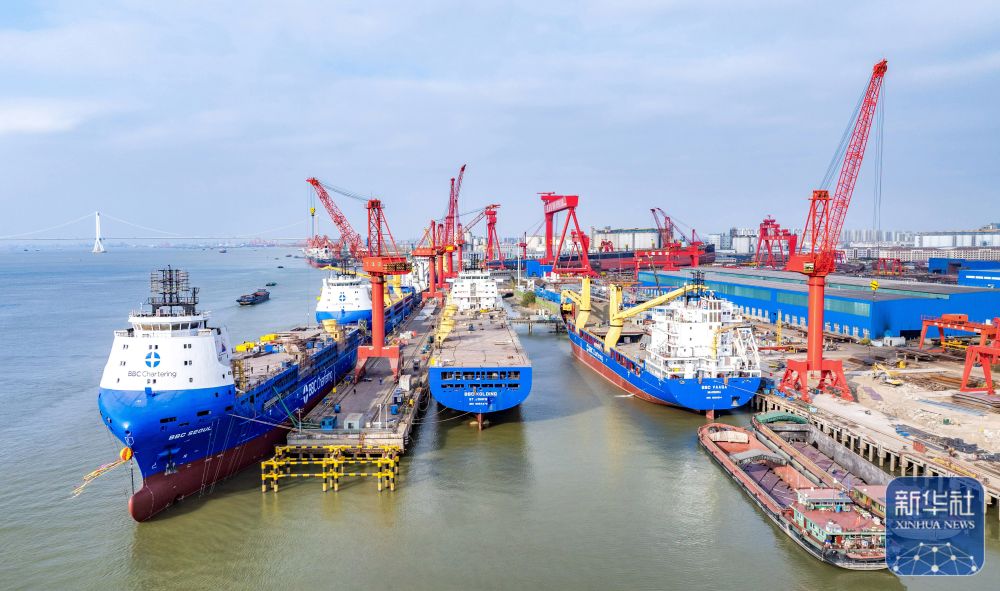 ↑ 12月15日,在位于江蘇省泰州市高港區的泰州三福船舶工程有限公司生產基地,多艘大型船舶在建造中(無人機照片)。新華社發(周社根攝)