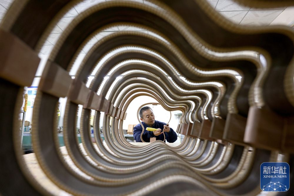 ↑ 12月15日,在河北省邯鄲市峰峰礦區一家裝備制造企業,工人在檢查導軌外觀。新華社發(郝群英攝)