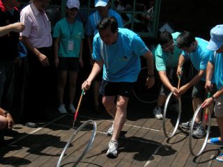 據(jù)報道,昨天,馬英九來到宜蘭國際童玩藝術節(jié)現(xiàn)場,在宜蘭縣長呂國華等人的陪同下暢游園區(qū)。他先與來自智利的舞蹈團隊熱情共舞,并前往“童玩童食回味屋”體驗兒時滾鐵圈的樂趣;在童玩節(jié)人氣指數(shù)最高的戲水區(qū),馬英九還下水盡情的玩水消暑,并和小朋友大打水仗,全身淋濕的馬英九說已經(jīng)很久沒有這樣痛快玩水,彷佛又回到兒時的感覺。