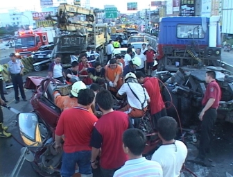 經(jīng)清算,共有16部大小車輛撞成一塊,其中一輛紅色小客車受創(chuàng)最嚴(yán)重,遭撞擊后整輛車瞬間變成一堆廢鐵,車內(nèi)4人都被卡在車內(nèi)。