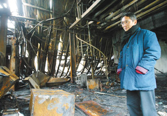 火熄了,云門舞集總監(jiān)林懷民走進(jìn)燒塌了的排練場,看著化為灰燼的心血沉思。(聯(lián)合報(bào)圖)