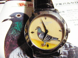 這是瑞士百達翡麗打造的彩繪表,表面上的賽鴿圖案是黃良德飼養的“新世紀”,它曾得過世界越洋冠軍,現已24歲高齡。