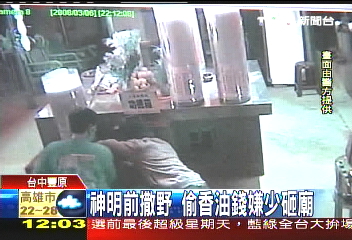 中國臺灣網3月16日消息 臺中豐原地區最近有4間寺廟被偷,行竊過程中,歹徒發現香油錢太少,很不滿意,竟然當場砸東西,還把桌子弄得一團亂。殊不知他們作案過程都被監視器清楚拍下,廟方開玩笑說,在神明面前撒野,難怪被抓。