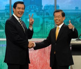 資料圖:馬英九與謝長廷在選舉前第二場電視辯論會開始時,應(yīng)主持人要求相互握手,兩人比出自己的號次,加深選民印象。