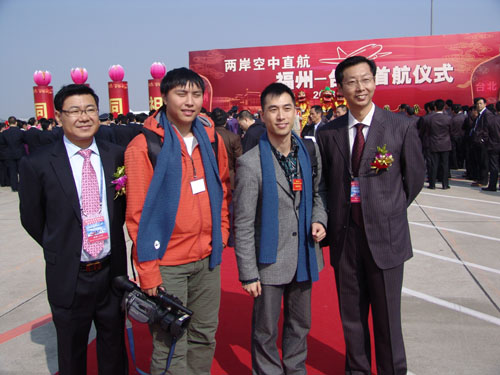 托運大包小包行李、準備好隨身攜帶的采訪設備、接受獻花、和大家握手告別,18日中午,帶著緊張興奮的心情,我們終于登上了福州首航臺北的班機。盡管飛機上的時間很倉促,但是采訪報道進展的還是很順利。機組、乘客都超級配合,氣氛也很融洽。在興奮的“臺北,我們來了”的叫聲中,飛機降落在松山機場。報道完噴水洗塵等迎接儀式后趕到行李廳,就剩我們幾個記者的行李沒拿了。一清點,居然發現裝話筒、電池、伴手禮的行李箱不見了,卻多出一個跟我們的行李箱有幾分相像的箱子,顯然是被錯拿了!在機場聯絡半天也沒有結果,只好填完一大疊單子委托機場尋找。