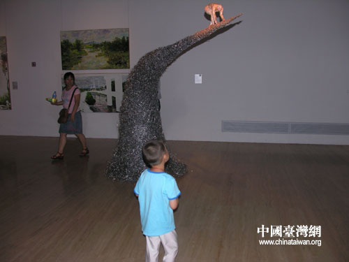 一位小觀眾在觀看臺灣藝術(shù)家楊劍平的作品“太遠(yuǎn)”。(中國臺灣網(wǎng) 蕪?fù)?攝)