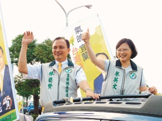 民進(jìn)黨籍宜蘭縣長候選人林聰賢(左)昨天挨告,仍在民進(jìn)黨主席蔡英文(右)陪同下掃街拜票。來源:臺(tái)灣《聯(lián)合報(bào)》