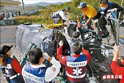 高雄縣內門鄉昨天發生重大車禍,一輛載有9人的廂型車,疑越過雙黃線撞上砂石車,釀成7死2傷慘劇,圖為救難人員搶救困在扭曲變形車體內的女司機。來源:臺灣《蘋果日報》