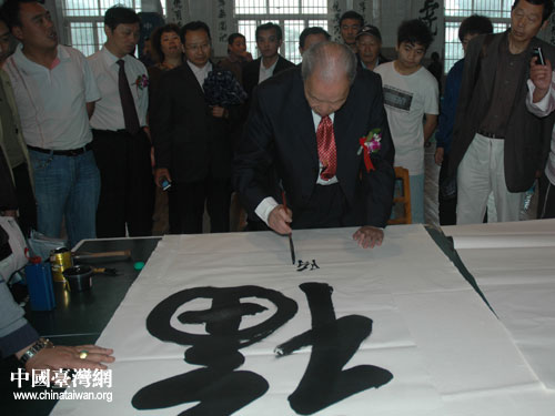 中國臺灣網5月13日九江消息 5月8日,九江學院體育訓練館內,一位九旬老人現場潑墨疾書,一幅幅遒勁有力的“福”、“壽”等大字頃刻完成。這位動作矯健、思維清晰的老人,就是蜚聲海內外的臺灣著名學者、書法家、社會活動家,臺灣名人李敖和連戰的授業恩師——陳大絡。