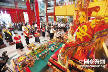 中國臺灣網6月28日臺灣消息 6月25日,來自洛陽關林的兩尊“關圣帝君”神像運抵臺灣高雄東照山關帝廟,并于當日下午舉行了安座大典。臺灣立法機構負責人王金平、臺當局前法務部門負責人蕭天贊、高雄縣縣長楊秋興、高雄市市長陳菊、臺民意代表黃昭順、臺灣中華道教關圣帝君弘道協會總會長郭有智、臺灣中華全球洪門聯盟總會長劉會進、臺北木柵指南宮主任高忠信等各界人士參加安座大典。