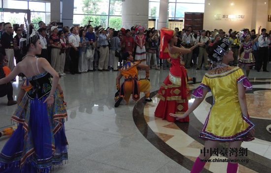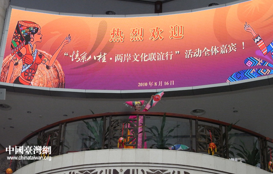 中國臺灣網8月17日南寧消息 “情系八桂——兩岸文化聯誼行”活動,8月16日上午在南寧市的廣西民族博物館拉開序幕。來自臺灣的101位文化界知名人士,一走進廣西博物館的的大廳,就被一場精彩的唱山歌、繡球傘、獨弦琴構成的具有濃郁民族特色的迎賓歌舞所包圍,