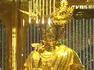 中國臺灣網(wǎng)9月17日消息 據(jù)臺灣TVBS電視臺報道,近日,隨著臺灣金價飆升,臺中縣鎮(zhèn)瀾宮的純金媽祖神像價值比7年前翻了近3倍已,達(dá)3億4000萬(新臺幣,下同)。鎮(zhèn)瀾宮方面擔(dān)心黃金媽祖被盜,做了多項防盜措施。