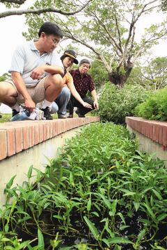 據張清華介紹說,新生園區共超過20多種水生植物,除空心菜、茭白筍,另有水芋頭、野姜花、蘆葦、睡蓮,還有臺灣珍稀水生植物穗花棋盤腳等。空心菜含花盆、6個月保活期,5盆共500元。(中國臺灣網 孫金誠)