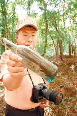 昨日踏查過程中,在壕溝內(nèi)撿到一只玻璃酒瓶,樹根已長進瓶內(nèi),近瓶底處瓶身刻有“日本麥酒礦泉株式會社”文字。文史工作者程士毅表示,以此推敲,日軍當年規(guī)劃補給設(shè)施準備長期抗戰(zhàn),從工事面積及規(guī)模、指揮所推測,戰(zhàn)壕約可容納一個加強營約500名軍士官。
