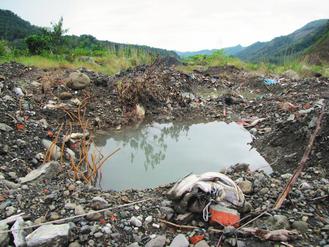 高雄縣甲仙鄉小林村遺址,疑似遭歹徒以機具開挖,罹難村民的鞋子等遺物,橫陳在積水的坑洞旁。圖片來源:臺灣《聯合報》