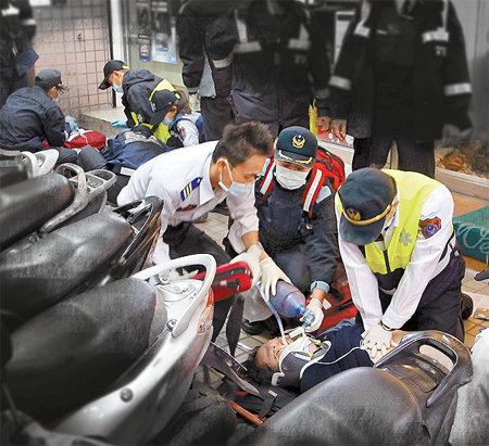 臺北縣中和市“金年春金仔店”銀樓遭搶,兩名嫌犯一人中彈(后)、一人猝死(前),警方在現(xiàn)場進(jìn)行搶救。 來源:臺灣媒體