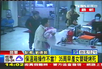 苗栗縣竹南鎮(zhèn)一家婦產(chǎn)科,5日清晨4時(shí)45分,接生一名體重1850克的女嬰,由于女嬰提早兩周出生,因此新生女嬰被放置在保溫箱內(nèi)照料,不過3個(gè)多小時(shí)后,護(hù)士發(fā)現(xiàn)女嬰呼吸不順暢,除緊急急救之外,也通知家屬到場,由于急救狀況不樂觀,女嬰也緊急轉(zhuǎn)院急救,但女嬰在到院前就已死亡。